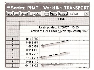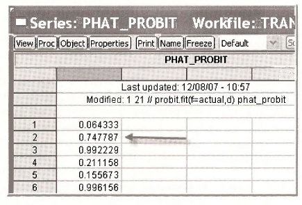 Open the series PHAT_PROBIT by double-clicking the series icon in the workfile window. The values of the predicted probabilities are given for each individual in the sample, based on their actual DTI ME.