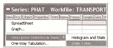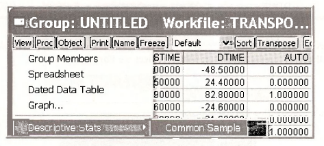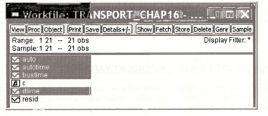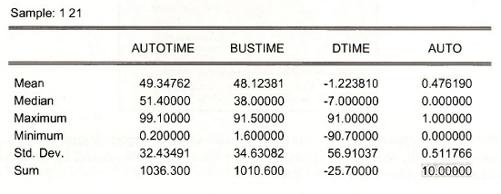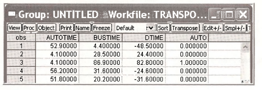 Open the workfile transport.wfl. Save the workfile with an new name to transportchapl6.wfl so that the original workfile will not be changed. Highlight the series AUTOTIME, BUSTIME, DTIME and AUTO in order. Double-click in the blue to open the Group. The data are shown on the next page.