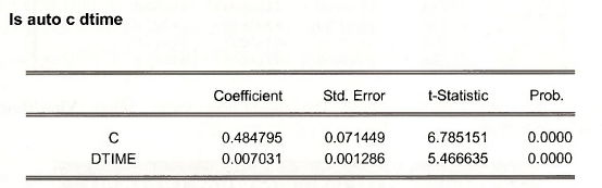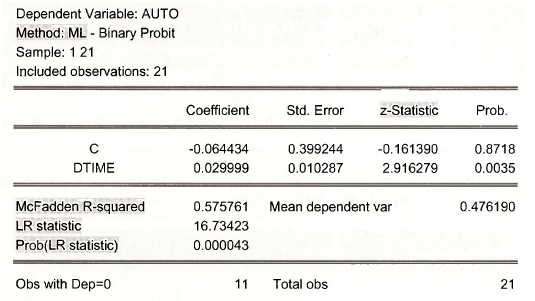 is called the linear probability model. It looks like a regression, but as noted in POE, page 420, there are some problems. Nevertheless, apply least squares using y = A UTO and x = DTIME.