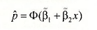 The “prediction” problem in probit is to predict the choice by an individual. We can predict the probability that individuals in the sample choose AUTO. In order to predict the probability that an individual chooses the alternative AUTO (y) = 1 we can use the probability model p = Φ(β1 + β2x) using estimates β1 = -0.0644 and β2 = 0.02999 of the unknown parameters obtained in the previous section.. Using these we estimate the probability p to be