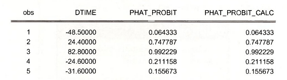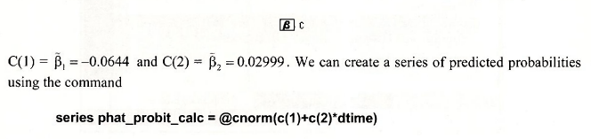 It is useful to see that these predicted probabilities can be computed directly using the EViews function @cnorm which is the CDF of a standard normal random variable, what we have called “Φ”. EViews places the estimates of the unknown parameters in the coefficient vector C,