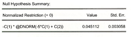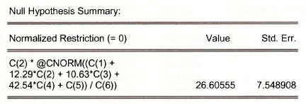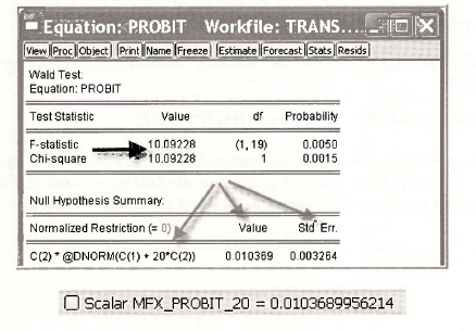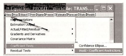 EViews is very powerful, and one of its features is the calculation of complicated nonlinear expressions involving parameters and computed their standard error by the “Delta” method. In the PROBIT estimation w indow, select View/Coefficient Tests/Wald – Coefficient Restrictions.
