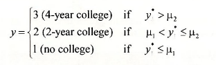 Because there are M = 3 alternatives there are M -1 = 2 thresholds μ1 and μ2, with μ1 < μ2. The index model does not contain an intercept because it would be exactly collinear with the threshold variables. If sentiment towards higher education is in the lowest category, then y* < μ1 and the alternative “no college” is chosen, if μ1 < y* < μ2 then the alternative “2-year college” is chosen, and if sentiment towards higher education is in the highest category, then y* > μ2 and “4- year college” is chosen. That is,
