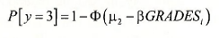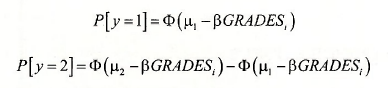 The coefficient of GRADES is the maximum likelihood estimate (3. The values labeled LIMIT_2:C(2) and LIMIT 3:C(3) are the maximum likelihood estimates of p, and p2. The notation points out that the these parameter estimates are saved into the coefficient vector as C(2) and C(3). C(l) contains J3. Name this equation OPROBIT.