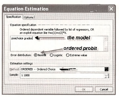 Enter the estimation equation with NO INTERCEPT. Make sure the Normal radio button is selected so that the model is Ordered Probit.