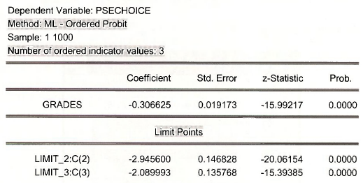 In EViews open the workfile nelssmalLwfl. Save it under the name nels small oprobitwfl. The dependent variable of interest is PSECHOICE and the explanatory variable is GRADES. Select Quick/Estimate Equation. In the drop down menu of estimation methods choose Ordered Choice.