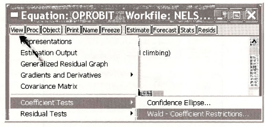 To predict the probabilities of various outcomes, as shown on page 436 of POE, we can again use the computing abilities of EViews. In the OPROBIT estimation window select View/Coefficient Tests/Wald – Coefficient Restrictions.