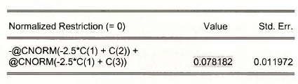 where as usual Φ is the CDF of a standard normal variable. To evaluate the marginal effect of EDUC on HOURS, given that HOURS > 0, we can use Wald test dialog box. Select View/Coefficient Tests/Wald – Coefficient Restrictions. Enter in the expression for the marginal effect of EDUC at the sample means, as shown on page 447 of POE.