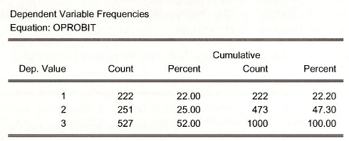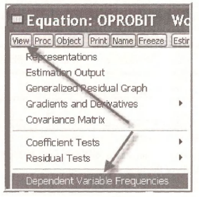 In the EViews window containing the estimated model OPROBIT, select View/Dependent Variable Frequencies