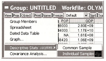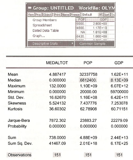 Open a group consisting of MEDALTOT, POP and GDP. Obtain summary statistics for the individual samples