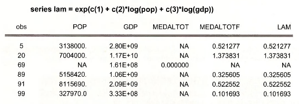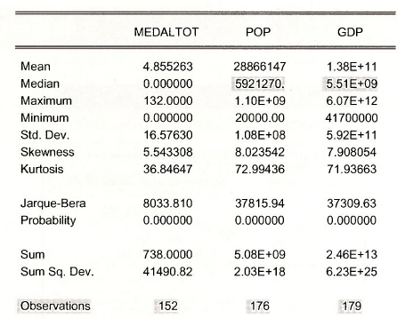 Note that there are 152 observations for MEDALTOT, 176 for POP and 179 for GDP.