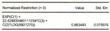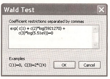 To compute the predicted mean for specific values of the explanatory variables we again use the trick of applying the “Wald test.” Select View/Coefficient TestsAVald – Coefficient Restrictions. We must choose some values for POP and GDP at which to evaluate the prediction. Enter the median values from the individual samples for POP and GDP.