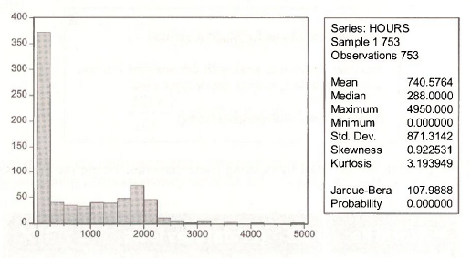 A Histogram of the variable HOURS shows the problem with the full sample. There are 753 observations on the wages of married women but 325 of these women did not engage in market work, and thus their HOURS = 0, leaving 428 observations with positive HOURS.