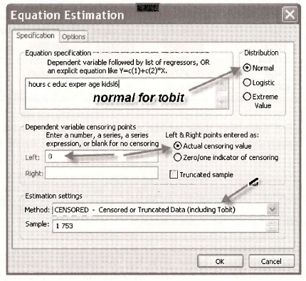 An appropriate estimation procedure is Tobit, which uses maximum likelihood principles. Select Quick/Estimate Equation. In the Equation Estimation window fill in the options as shown below. Tobit estimation is predicated upon the regression errors being Normal, so tick that radio button. In our cases the observations that are “censored” take the actual value 0, and the dependent variable is said to be Left censored because 0 is a minimum value and all relevant values of HOURS are positive. The Estimation settings show the method to include Tobit.