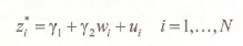 The econometric model describing the situation is composed of two equations. The first, is the selection equation that determines whether the variable of interest is observed. The sample consists of N observations, however the variable of interest is observed only for n < N of these. The selection equation is expressed in terms of a latent variable z* which depends on one or more explanatory variables w,., and is given by