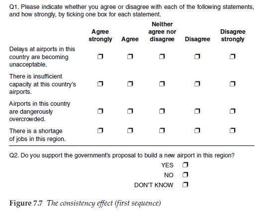 It should be expected that the responses to Q2 will show significant variation between Figures 7.7 and 7.8. By using statements that reflect one side of an argument, in this case for and against the building of a new airport, respondents are led to Q2 along different paths. Most people like to appear to be consistent. If they agree with the statements in Q1, it is then very difficult not to answer ‘yes’ at Q2 in the first example or ‘no’ in the second example.