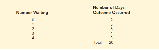 These data show that on 2 of the 20 days, zero patients were waiting for service; on 5 of the days, one patient was waiting for service; and so on. Using the relative frequency method, we would assign a probability of 2/20 = .10 to the experimental outcome of zero patients waiting for service, 5/20 = .25 to the experimental outcome of one patient waiting, 6/20 = .30 to two patients waiting, 4/20 = .20 to three patients waiting, and 3/20 = .15 to four patients waiting. As with the classical method, using the relative frequency method automatically satisfies the two basic requirements of equations (4.3) and (4.4).
