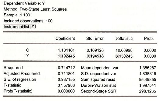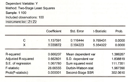 We now turn our attention to the method of instrumental variables estimation, also known as two- stage least squares, described in the text. Instrumental variables estimation produces consistent estimators in the presence of correlation between a random regressor, x, and the error term, e. To obtain the instrumental variables estimates, select Quick/Estimate Equation, and in the Equation Specification dialog box under Estimation Settings, change the Method to: TSLS – Two-Stage Least Squares (TSNLS and ARMA). Next we enter the savings equation in list form Y C X, in the Equation Specification field. Finally, we list the instrument, Zl, in the Instrument List field.