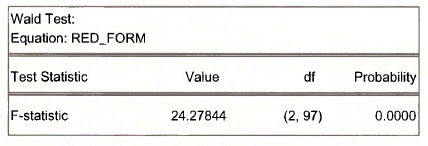 The test result shows that we strongly reject the null hypothesis, and we can conclude that at least one of the reduced form parameters is not zero. Also the F-value is 24.28, which exceeds the rule of thumb guideline of F > 10.