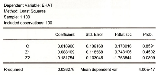 To test the validity of the surplus instrumental variable we save the TSLS residuals, and regress them on all the instrumental variables.