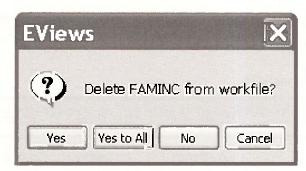 If you are using the EViews 6 Student Version you will get a message saying the workfile is too large. Select all the variable shown above by clicking while holding down the Ctrl-key. Right- click in the blue area, and select Delete. A message like the following will appear, depending on which variable you selected first.