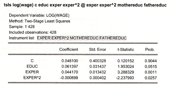 Note that the instrumental variable MOTHEREDUC is very significant, with a /-value of 8.6, indicating that this variable is strongly correlated with EDUC.