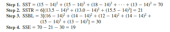 To compute the F statistic needed to test for a difference among treatment means with a randomized block design, we need to compute MSTR and MSE. To calculate these two mean squares, we must first compute SSTR and SSE; in doing so, we will also compute SSBL and SST. To simplify the presentation, we perform the calculations in four steps. In addition to k, b, and nT as previously defined, the following notation is used.