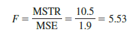 The numerator degrees of freedom is k – 1 = 3 – 1 = 2 and the denominator degrees of freedom is (k – 1)(b – 1) = (3 – 1)(6 – 1) = 10. Because we will only reject the null hypothesis for large values of the test statistic, the p-value is the area under the F distribution to the right of F = 5.53. From Table 4 of Appendix B we find that with the degrees of freedom 2 and 10, F = 5.53 is between F.025 = 5.46 and F.01 = 7.56. As a result, the area in the upper tail, or the p-value, is between .01 and .025. Alternatively, we can use statistical software to show that the exact p-value for F = 5.53 is .024. With p-value < a = .05, we reject the null hypothesis H0: m1 = m2 = m3 and conclude that the population mean stress levels differ for the three workstation alternatives.