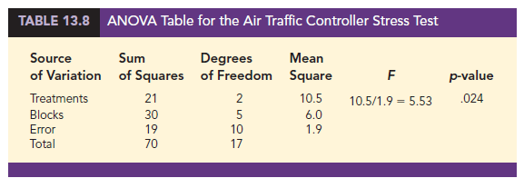 Finally, note that the ANOVA table shown in Table 13.7 provides an F value to test for treatment effects but not for blocks. The reason is that the experiment was designed to test a single factor—workstation design. The blocking based on individual stress differences was conducted to remove such variation from the MSE term. However, the study was not designed to test specifically for individual differences in stress.