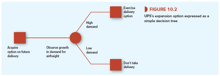 Figure 10.2 displays UPS’s expansion option as a simple decision tree. You can think of it as a game between UPS and fate. Each square represents an action or decision by the company. Each circle represents an outcome revealed by fate. In this case, there is only one outcome— when fate reveals the airfreight demand and UPS’s capacity needs. UPS then decides whether to exercise its options and buy the additional aircraft. Here the future decision is easy: Buy the airplanes only if demand is high and the company can operate them profitably. If demand is low, UPS walks away and leaves Boeing with the problem of finding another customer for the planes that were reserved for UPS.