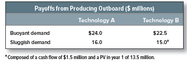 Just for simplicity, assume that the initial capital outlays are the same for both technologies. If demand in the first year is buoyant, technology A will provide a payoff of $24 million. If demand is sluggish, the payoff from A is $16 million. Think of these payoffs as the project’s