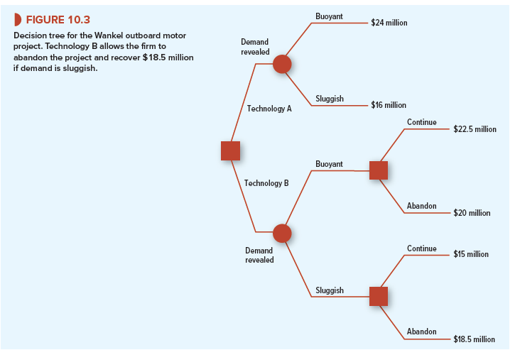 Figure 10.3 summarizes Example 10.1 as a decision tree. The abandonment option occurs at the right-hand boxes for technology B. The decisions are obvious: Continue if demand is buoyant, abandon otherwise. Thus the payoffs to technology B are