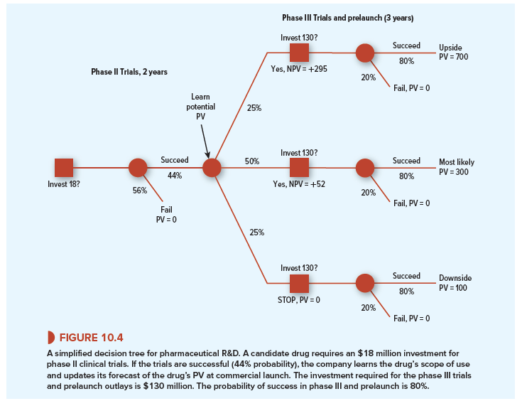 Figure 10.4 is a decision tree that illustrates these decisions. We have assumed that a new drug has passed phase I clinical trials with flying colors. Now it requires an investment of $18 million for phase II trials. These trials take two years. The probability of success is 44%.