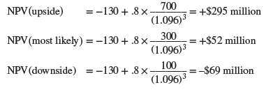 Since the downside NPV is negative at -$69 million, the $130 million investment at the start of phase III should not be made in the downside case. There is no point investing $130 million for an 80% chance of a $100 million payoff three years later. Therefore the value of the R&D program at this point in the decision tree is not -$69 million, but zero.