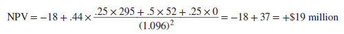 Now calculate the NPV at the initial investment decision for phase II trials. The payoff two years later depends on whether the drug delivers on the upside, most likely, or downside: a 25% chance of NPV = +$295 million, a 50% chance of NPV = +$52 million, and a 25% chance of cancellation and NPV = 0. These NPVs are achieved only if the phase II trials are successful: There is a 44% chance of success and a 56% chance of failure. The initial investment is $18 million. Therefore, NPV is