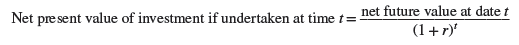 Timing decisions are fairly straightforward under conditions of certainty. You need to examine alternative dates for making the investment and calculate its net future value at each of these dates. Then, to find which of the alternatives would add most to the firm’s current value, you must discount these net future values back to the present: