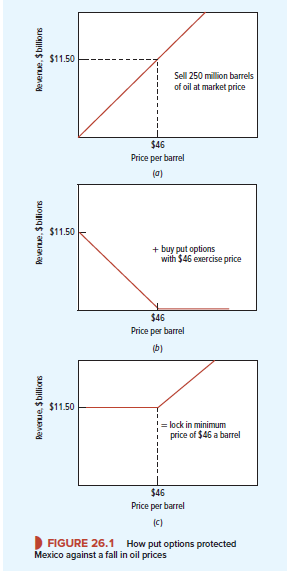 Figure 26.1 illustrates the nature of Mexico’s insurance strategy. Panel a shows the revenue derived from selling 250 million barrels of oil. As the price of oil rises or falls, so do the government’s revenues. Panel b shows the payoffs to the government’s options to sell 250 million barrels at $46 a barrel. The payoff on these options rises as oil prices fall below $46 a barrel. This payoff exactly offsets any decline in oil revenues. Panel c shows the government’s total revenues after buying the put options. For prices below $46 per barrel, revenues are fixed at 250 X $46 = $11,500 million. But for every dollar that oil prices rise above $46, revenues increase by $250 million. The profile in panel c should be familiar to you. It represents the payoffs to the protective put strategy that we first encountered in Section 20-2.