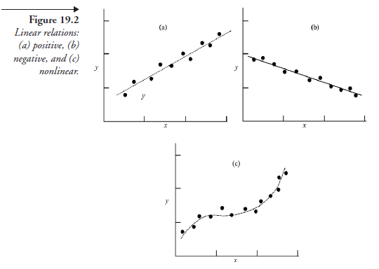 The simplest mathematical relation among several points, each a relation between the independent and the dependent variable, is the equation of a straight line that best fits all the points of the scatter diagram. It is then said that the two variables have a linear relation. Figure 19.2 shows three variations of linear relation: (1) directly (or positively) related, (2) inversely (or negatively) related, and (3) not related, meaning there is no causal relation (though there is an association). We confine ourselves in this book to regression with linear relations only, though there are frequent cases wherein linear regression is not possible. For a study of nonlinear regression, the reader is advised to refer to an advanced book on statistics.