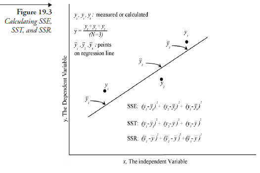 where y is the “estimated” y value of an observation (now to be read on the regression line), and Y is the mean of all the y values as observed. In passing, it may be mentioned that in the fields of business and economics, a correlation with r2 = 0.6 or higher is considered satisfactory. In most laboratory experiments, a much higher r2 than 0.6 is desirable. Figure 19.3 summarizes the methods for evaluating SSE, SST, and SSR, restricted for demonstration to only three data points.