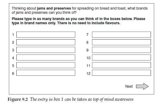 and to record responses in a series of boxes that can be labelled ‘First brand’, ‘Second brand’ and so on (Figure 9.2). This is generally preferable as the respondent has only one screen to read and complete rather than two. It also does not highlight the first brand, which may affect later responses. It has been shown that the two approaches give comparable results (Cape, Lorch and Piekarski, 2007) so there is no benefit in the longer approach.