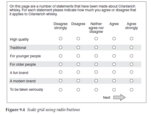 For more complex grids of statements and responses there are a number of options. One is to replicate the layout of paper questionnaires, with statements displayed down one side (or both sides if bi-polar) with the response options given as radio buttons across the page (Figure 9.4). This is a familiar layout to most questionnaire writers.