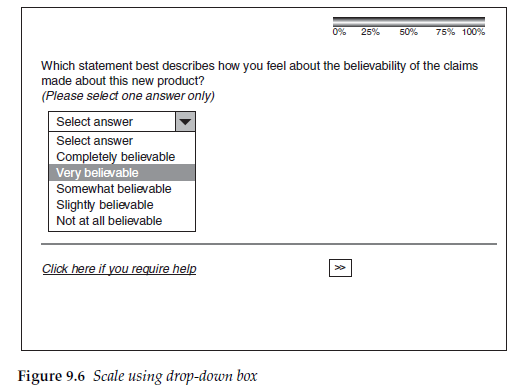 An option only available with electronic questionnaires is the dropdown box (see Figure 9.6). A drop-down box following the statement can contain the full scale. Respondents only have to click on their choice of response for it to be displayed and recorded. Again, a little more effort is required than with radio buttons. There might also be concerns that the direction in which the scale is displayed, with either the positive or negative end of the scale at the top of the drop-down box, will introduce a bias. This bias could be expected to be greater than that associated with the direction of the scale when using radio buttons, as respondents may not read all the way down the scale.