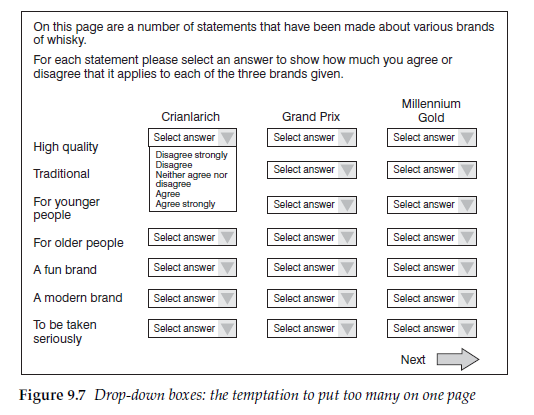 An advantage of both the drop-down and the write-in box is that more responses can be accommodated on one page. However, the questionnaire designer must take care not to make the page look overly complicated or daunting (Figure 9.7).