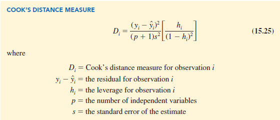 Cook’s distance measure uses both the leverage of observation i, hi, and the residual for observation i, (y – yi), to determine whether the observation is influential.