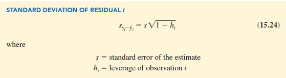 In general, the presence of one or more outliers in a data set tends to increase 5, the standard error of the estimate, and hence increase syi-y^i, the standard deviation of residual i. Because syi-y^i appears in the denominator of the formula for the standardized residual (15.23), the size of the standardized residual will decrease as 5 increases. As a result, even though a residual may be unusually large, the large denominator in expression (15.23) may cause the standardized residual rule to fail to identify the observation as being an outlier. We can circumvent this difficulty by using a form of the standardized residuals called studentized deleted residuals.