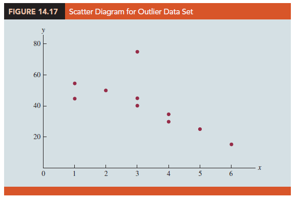 Figure 14.17 is a scatter diagram. Except for observation 4 (x4 = 3, y4 = 75), a pattern suggesting a negative linear relationship is apparent. Indeed, given the pattern of the rest of the data, we would expect y4 to be much smaller and hence would identify the corresponding observation as an outlier. For the case of simple linear regression, one can often detect outliers by simply examining the scatter diagram.