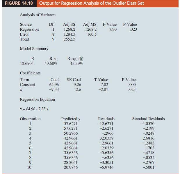 The standardized residuals can also be used to identify outliers. If an observation deviates greatly from the pattern of the rest of the data (e.g., the outlier in Figure 14.16), the corresponding standardized residual will be large in absolute value. Many computer packages automatically identify observations with standardized residuals that are large in absolute value. For the data in Table 14.11, Figure 14.18 shows the output from a regression analysis, including the regression equation, the predicted values of y, the residuals, and the standardized residuals. The highlighted portion of the output shows that the standardized residual for observation 4 is 2.67. With normally distributed errors, standardized residuals should be outside the range of -2 to +2 approximately 5% of the time.