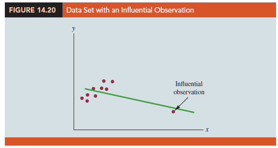 Figure 14.20 shows an example of an influential observation in simple linear regression. The estimated regression line has a negative slope. However, if the influential observation were dropped from the data set, the slope of the estimated regression line would change from negative to positive and the y-intercept would be smaller. Clearly, this one observation is much more influential in determining the estimated regression line than any of the others; dropping one of the other observations from the data set would have little effect on the estimated regression equation.