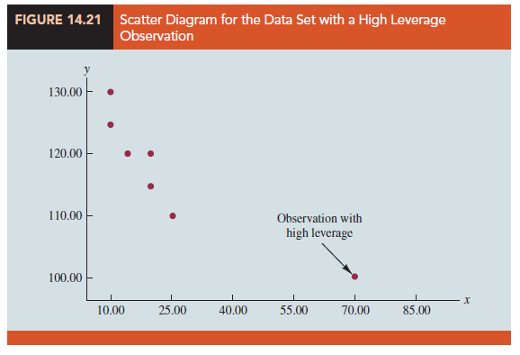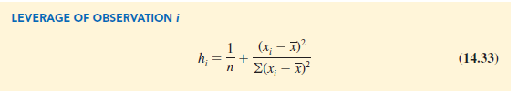 Observations with extreme values for the independent variables are called high leverage points. The influential observation in Figure 14.20 is a point with high leverage. The leverage of an observation is determined by how far the values of the independent variables are from their mean values. For the single-independent-variable case, the leverage of the ith observation, denoted h, can be computed by using equation (14.33).