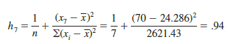 From Figure 14.21, a scatter diagram for the data set in Table 14.12, it is clear that observation 7 (x = 70, y = 100) is an observation with an extreme value of x. Hence, we would expect it to be identified as a point with high leverage. For this observation, the leverage is computed by using equation (14.33) as follows.